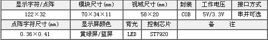 - 描述:品牌:金鵬 帶中文字庫 串并可調,模塊尺寸:70X34X11 視域尺寸:58X20 控制IC:7920,封裝COB(進貨串口)