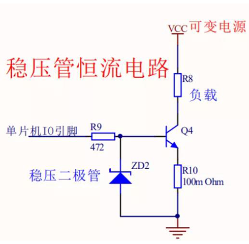穩(wěn)壓二極管的恒流電路中,三極管Q4的基級電壓被限定在穩(wěn)壓二極管工作的穩(wěn)定電壓Uzd下,因此R10電阻的電壓等于Uzd減去三極管基級與發(fā)射級的導(dǎo)通壓降0.7V,即U=Uzd-0.7保持恒定不變,所以流過R10電阻的電流在VCC電源即使可變的條件下也是固定不變,也就是R8負載的電流保持不變,達到恒流的效果。