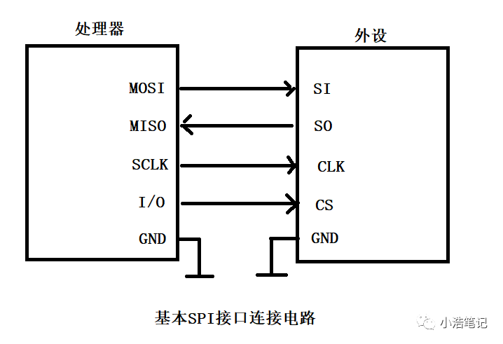 SPI主要使用四個(gè)信號(hào):主機(jī)輸出/從機(jī)輸入(MOSI)、主機(jī)輸入/從機(jī)輸出(MISO)、串行SCLK或SCK、外設(shè)芯片(CS)。有些處理器有SPI接口專用的芯片選擇,稱為從機(jī)選擇SS。