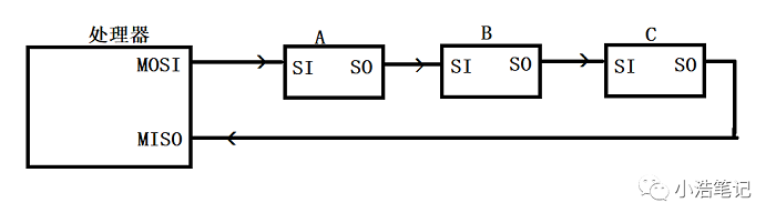 其他外設(shè)只需要一個(gè)單字節(jié)(比如一個(gè)發(fā)給A/D轉(zhuǎn)換器的命令),有些甚至還支持菊花鏈連接,菊花鏈連接三臺(tái)SPI設(shè)備,如下圖: